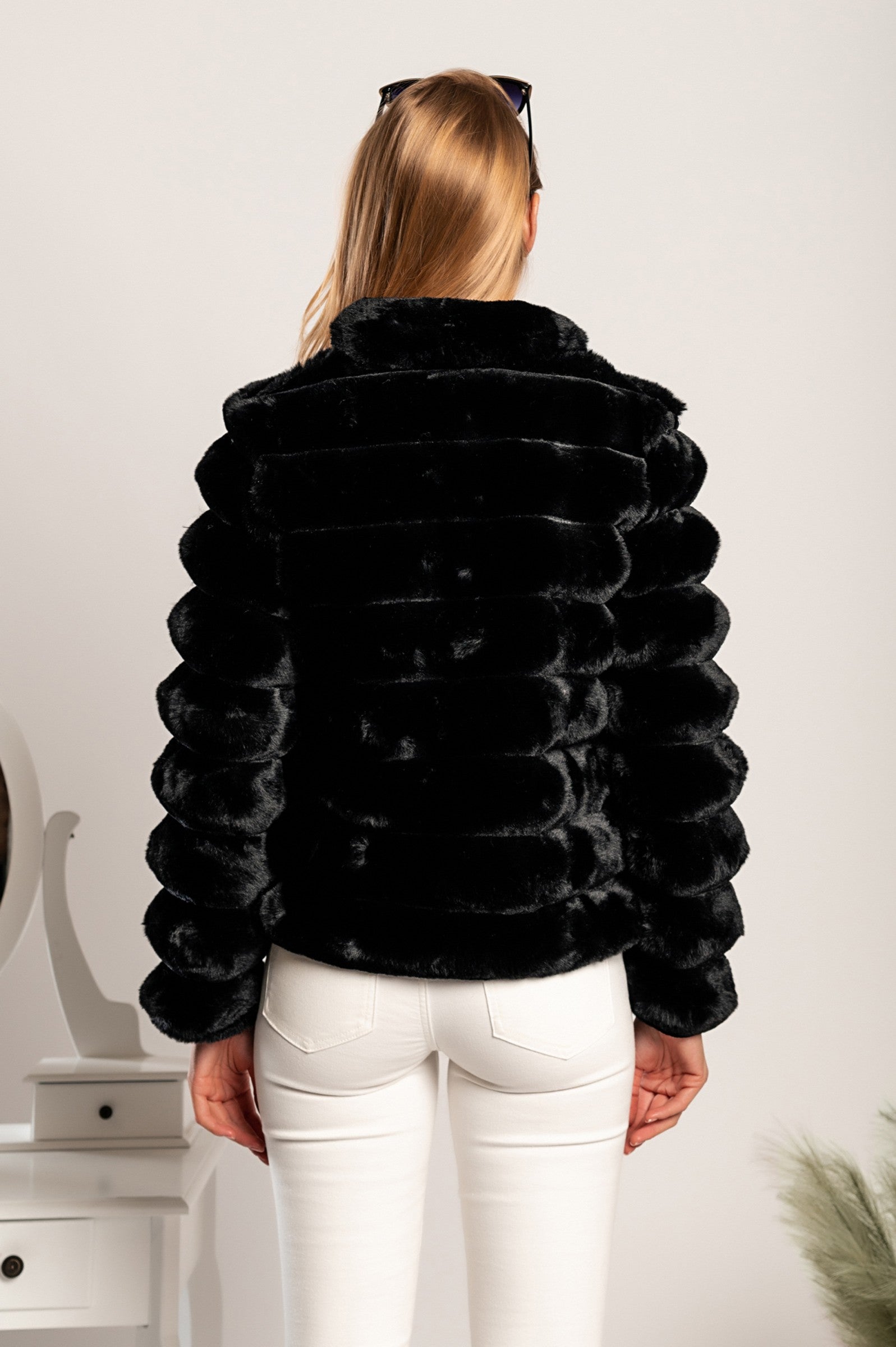 The beautiful short faux fur coat is made of high quality soft and comfortable fabric that offers perfect comfort. The coat has a stand-up collar and two pockets at the front. It closes with hooks. The item is also available in larger sizes up to 2XL. It is suitable for both everyday and elegant occasions.